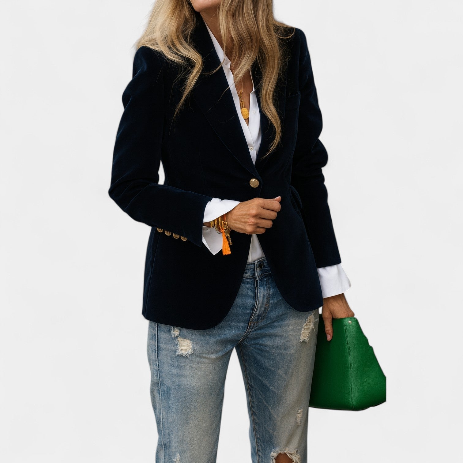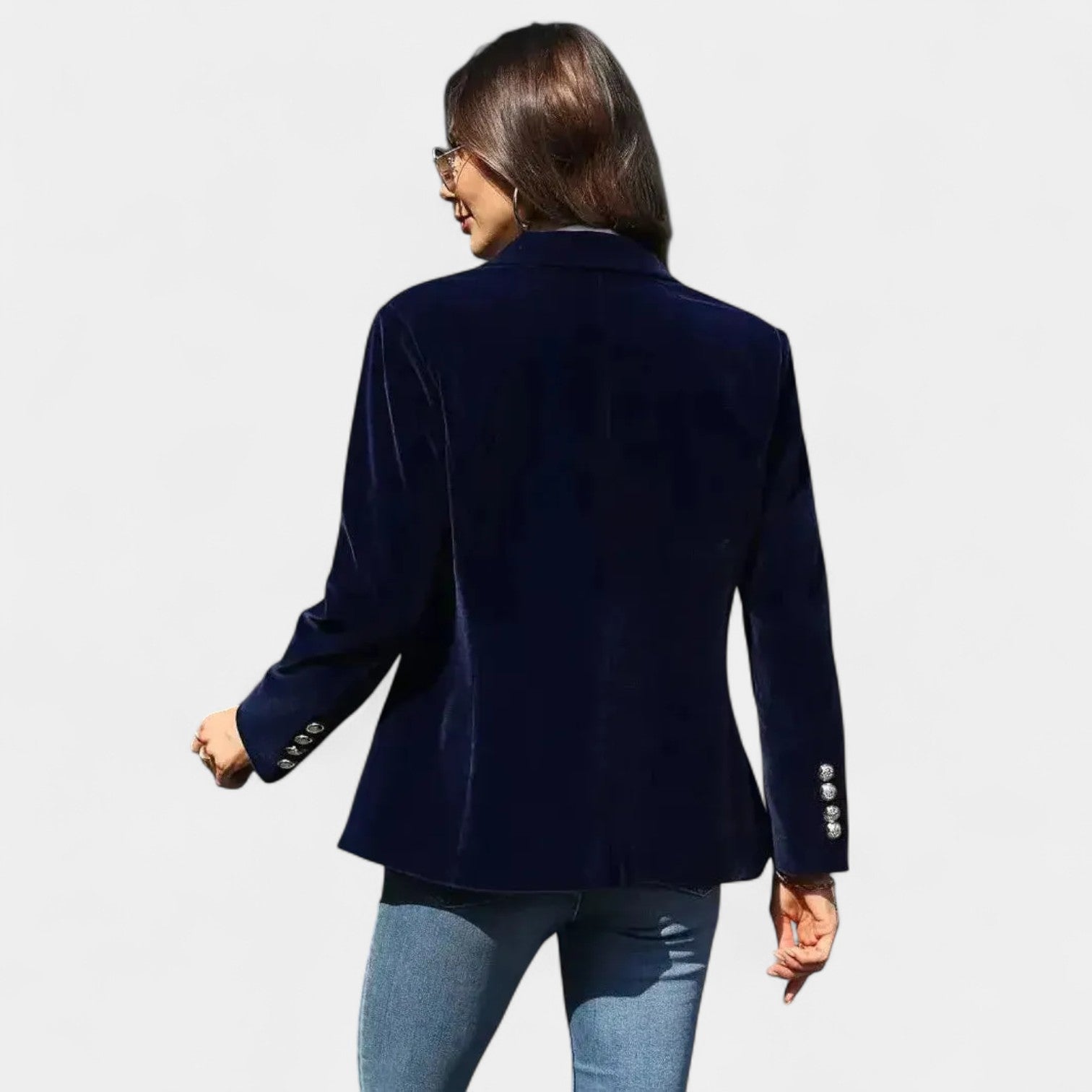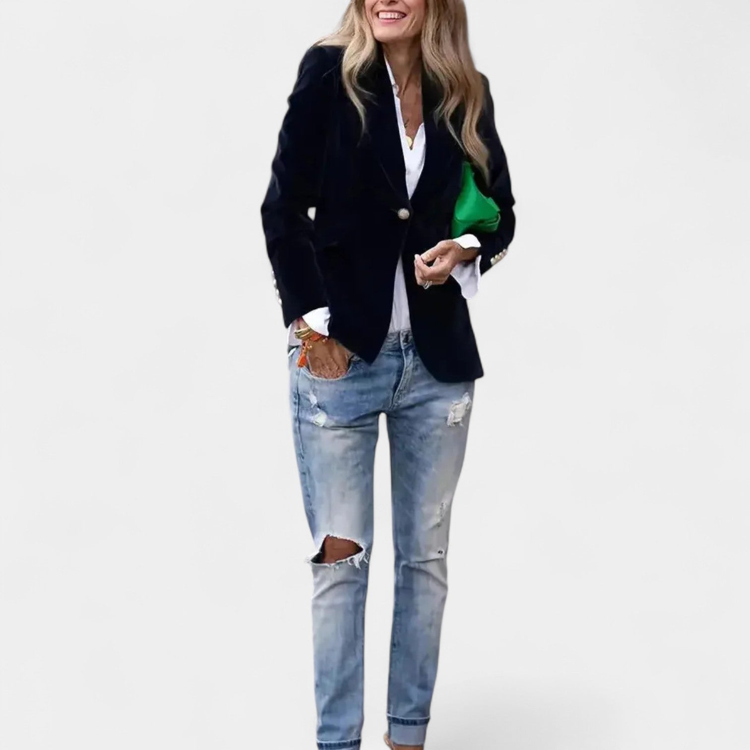 Το σακάκι Αντρέα με λεπτή βελούδινη επιφάνεια είναι το τέλειο κομμάτι για γυναίκες που θέλουν να φαίνονται κομψές και αυτοπεποίθησες σε κάθε κατάσταση. Χάρη στην ακριβή γραμμή του με μονό κουμπί, τις κοφτές πέτες και τους ελαφρώς ενισχυμένους ώμους, δημιουργεί μια κολακευτική σιλουέτα που ταιριάζει τόσο σε τζιν όσο και σε πιο κομψά σύνολα. Οι χρυσές κουμπότρυπες στα μανίκια προσθέτουν μια κομψή λεπτομέρεια.