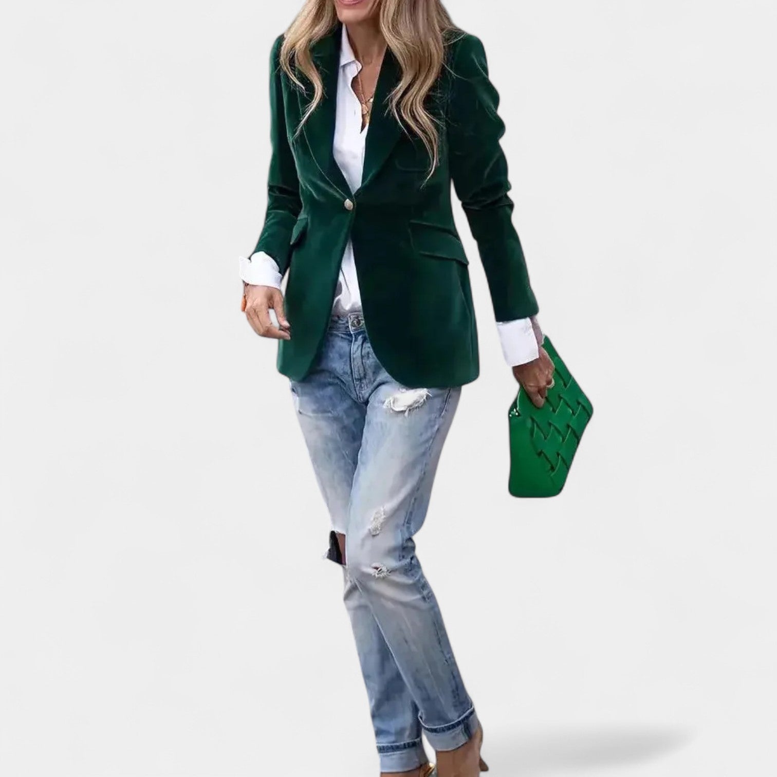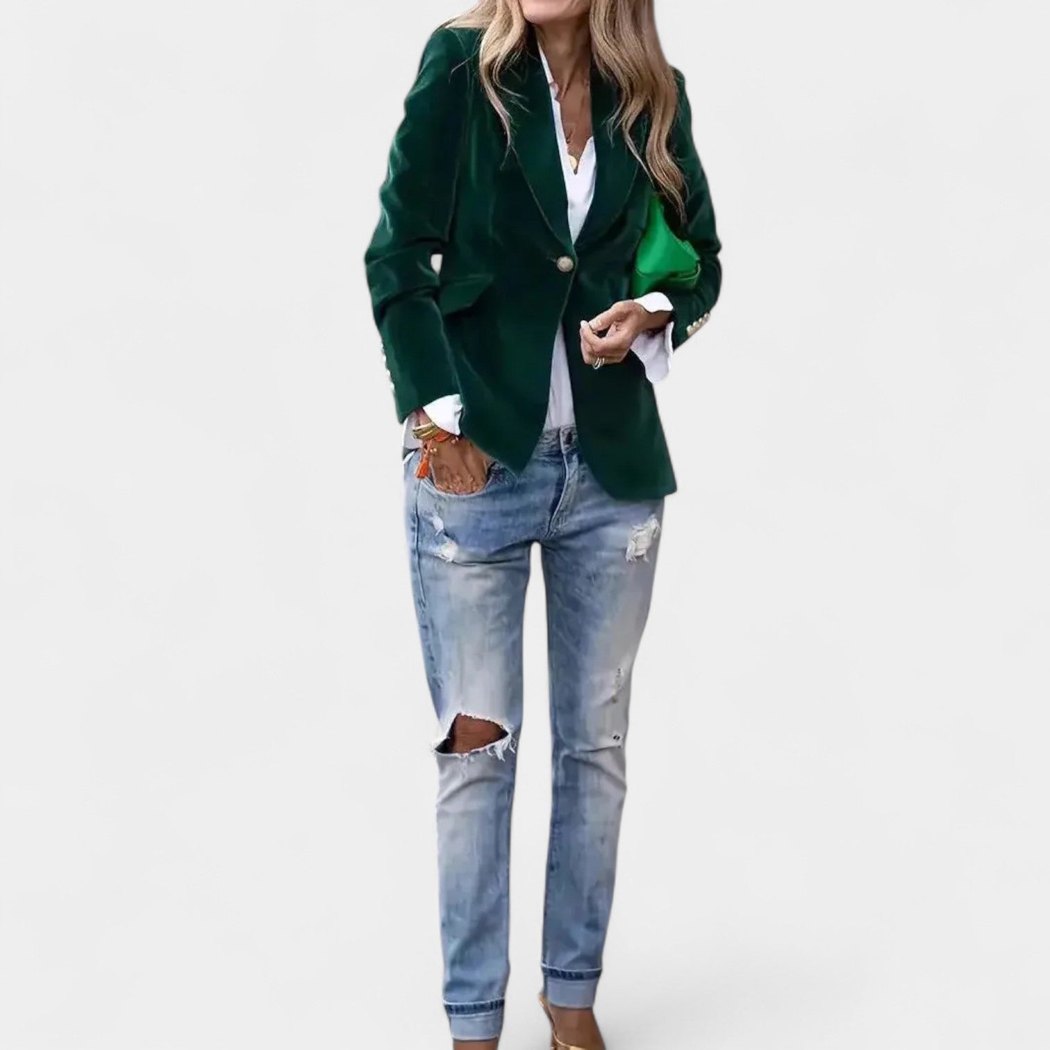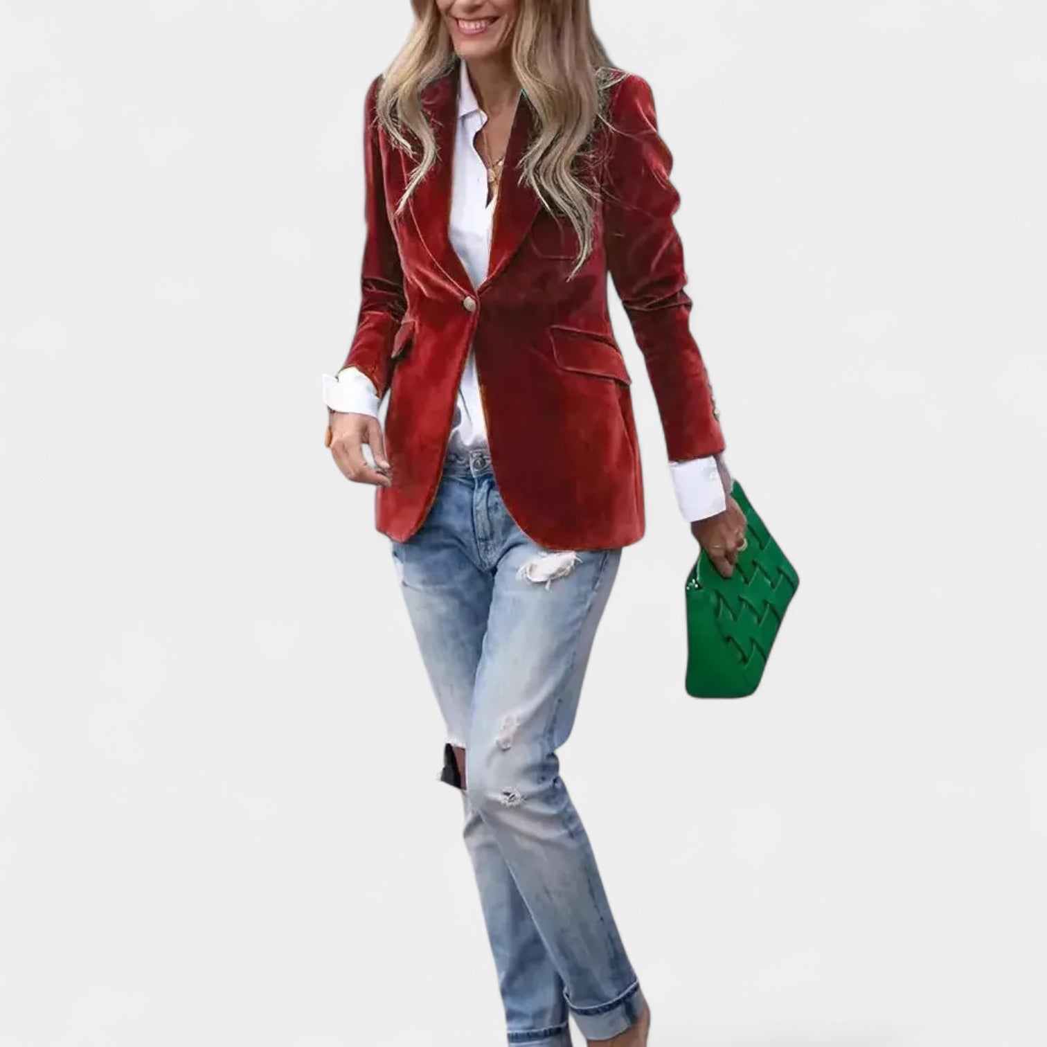 Το σακάκι Αντρέα με λεπτή βελούδινη επιφάνεια είναι το τέλειο κομμάτι για γυναίκες που θέλουν να φαίνονται κομψές και αυτοπεποίθησες σε κάθε κατάσταση. Χάρη στην ακριβή γραμμή του με μονό κουμπί, τις κοφτές πέτες και τους ελαφρώς ενισχυμένους ώμους, δημιουργεί μια κολακευτική σιλουέτα που ταιριάζει τόσο σε τζιν όσο και σε πιο κομψά σύνολα. Οι χρυσές κουμπότρυπες στα μανίκια προσθέτουν μια κομψή λεπτομέρεια.