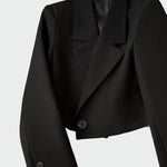 Μινιμαλιστικό κοντό σακάκι με κομψό σχέδιο και σύγχρονες λεπτομέρειες. Ο γιακάς με τις αιχμηρές γραμμές και το μπροστινό κλείσιμο προσδίδουν δυναμικό χαρακτήρα, ενώ η κοντή γραμμή το καθιστά ιδανικό για στυλάτες εμφανίσεις. Φοριέται εύκολα τόσο σε επαγγελματικές όσο και σε βραδινές περιστάσεις.