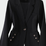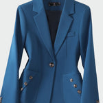 Επιβλητικό σακάκι με γυναικεία γραμμή, που ξεχωρίζει για τις κομψές λεπτομέρειες. Ένα κουμπί στην μπροστινή πλευρά προσθέτει μινιμαλιστική κομψότητα, ενώ τα διακοσμητικά κουμπιά στις τσέπες προσφέρουν μοντέρνα αίσθηση. Ιδανικό για επαγγελματικές συναντήσεις, αλλά και για βραδινές εξόδους με στυλ.