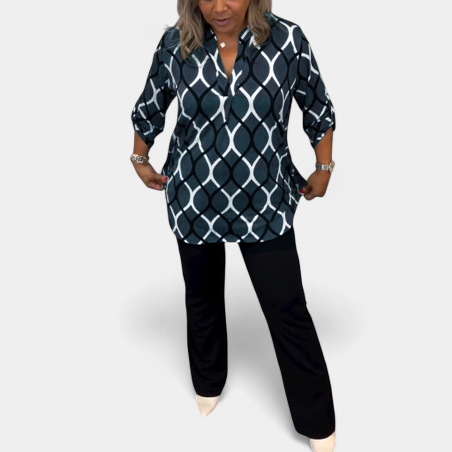Η μπλούζα Πέτρα εντυπωσιάζει με το πρωτότυπο γραφικό της σχέδιο, που αμέσως φωτίζει κάθε εμφάνιση. Χάρη στη χαλαρή γραμμή και τα τρία τέταρτα μανίκια, είναι άνετη αλλά και κομψή ταυτόχρονα. Ιδανική επιλογή τόσο για κομψά παντελόνια όσο και για casual τζιν.